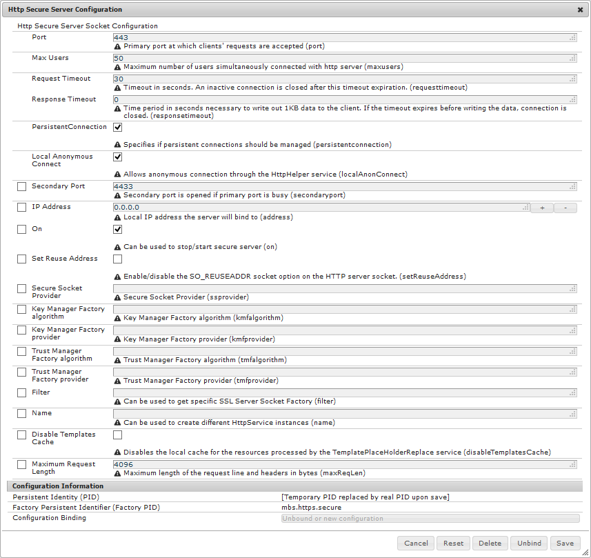 The HTTP Secure Server Configuration allows configuring the attributes of secure HTTP communication. The PID of the configuration dictionary is mbs.http.secure and its properties are described in details in the Setup Guide.