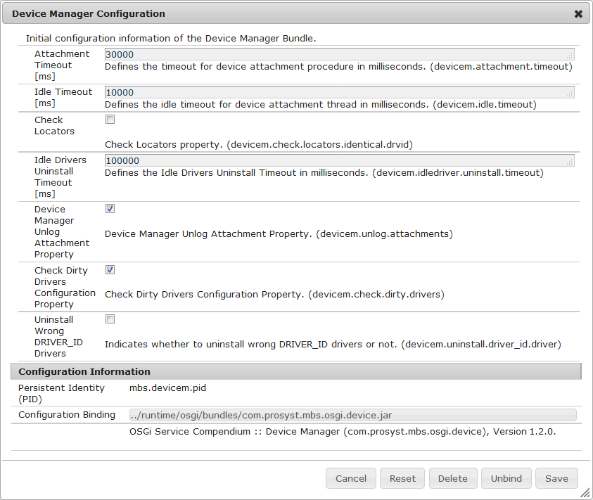You can use the Web Console to conveniently configure the Device Manager Bundle by using a general property editor for the mbs.devicem.pid configuration dictionary. The properties are described in the Setup guide.