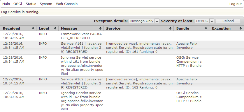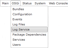 - Through the OSGi tab >Log Service option, you can view all queued logs or filter them by level. Refer to Viewing Framework Logs for more information.