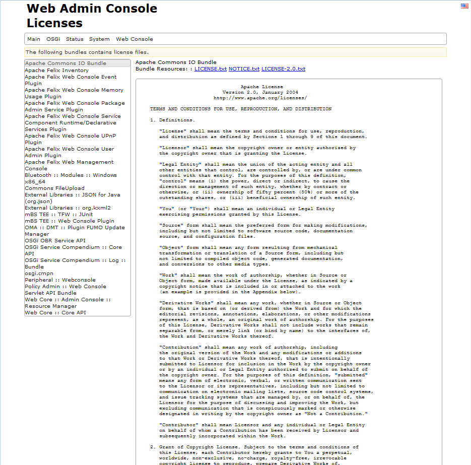 You may view all the license files and notices (included inside each bundle) in usage on your runtime by clicking the Licenses tab on your Web Console, as seen bellow.