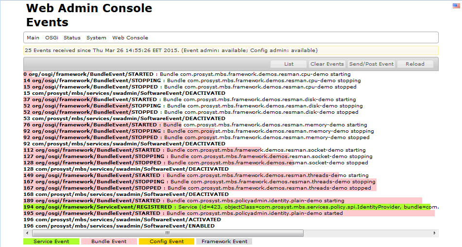 Use the Timeline button to switch to this view. Events are ordered according to their timestamp, i.e. the time when the event occurred. For your convenience, a colour scheme is provided to easily differentiate the Service, Bundle, Framework and Config Events.