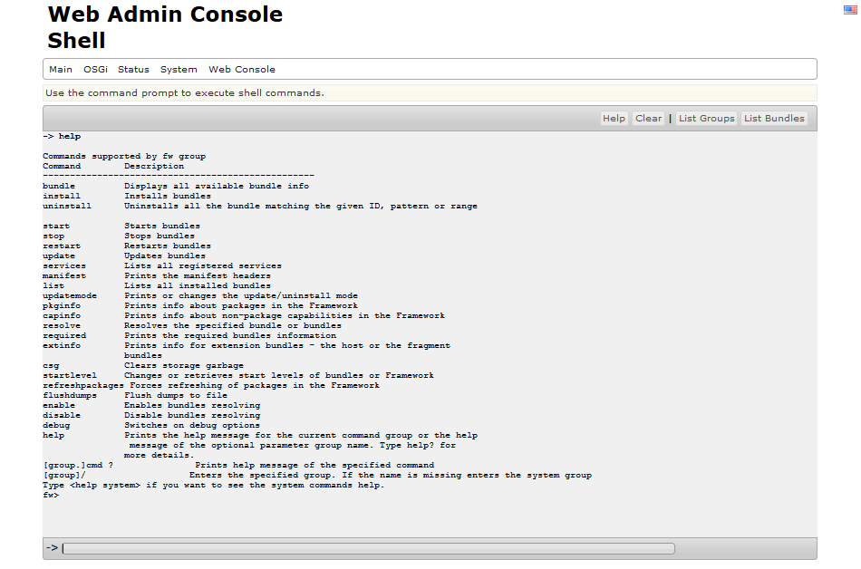 Shell commands can be executed from the Shell page of the Web Console. This is a standard console allowing you to issue framework console commands to the running server.