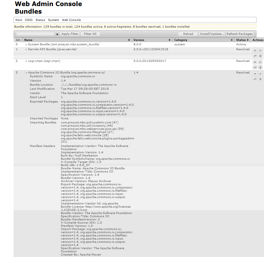 Imported Packages - Contains a list of all packages imported by the bundle and the symbolic name of the bundle that exports the specific package. Click on the symbolic name of the exporting bundle and its general information will be displayed.