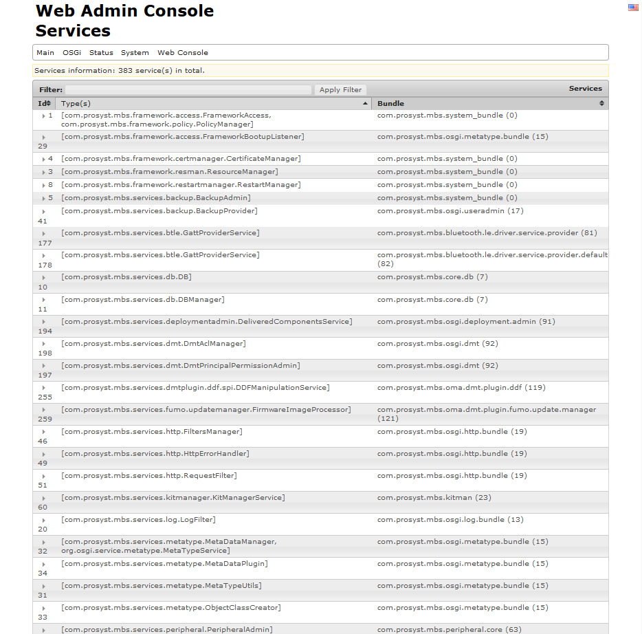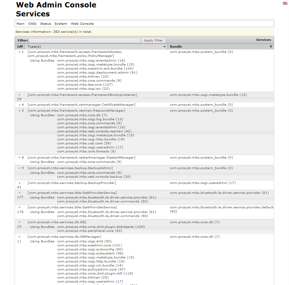 To view the services exported by all bundles running in the framework, navigate to the Services page through the corresponding navigation tab.