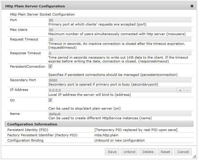 As a result, the newly created configuration will appear under the factory configuration and you can edit the values of its properties . The PID of the configuration is generated automatically and is displayed in the Persistent Identity (PID) field of the Configuration Information section.