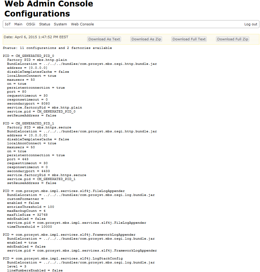 You can see the framework configuration status by selecting Status > Configurations navigation tab. You can see the currently set system properties of the framework, running threads, installed bundles, provided bundle configuration data, registered services and preferences, and also registered service components.