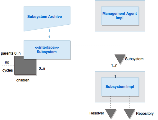 The defaulted definition of a subsystem is based on the name and contents of the Subsystem Archive. Installing a new Subsystem results in another Subsystem service being registered to represent that Subsystem in the runtime. Each Subsystem service enables management and reflection of the Subsystem it represents.