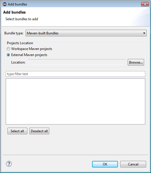 The workspace and external location if the bundle is packed as a Maven project – use the Maven-built Bundles option as Bundle type.