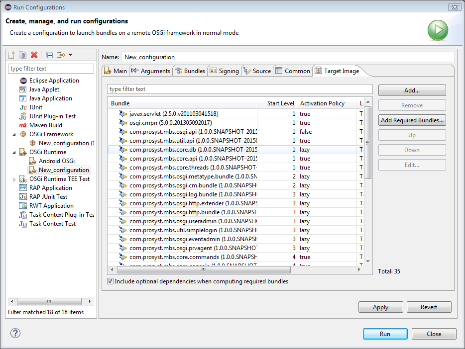 You can use an already configured image definition and set startup options, modify, if needed, the list of preloaded bundles and add bundles from the workspace. To do so, repeat all steps from the previous guide - Use a Ready Image Definition and then execute the following: