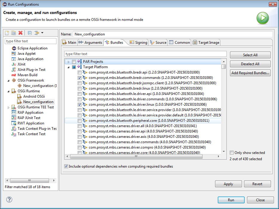 To have the bundles, required by the ones you have already selected, automatically installed in the emulated OSGi Runtime, use the Add required bundles button.