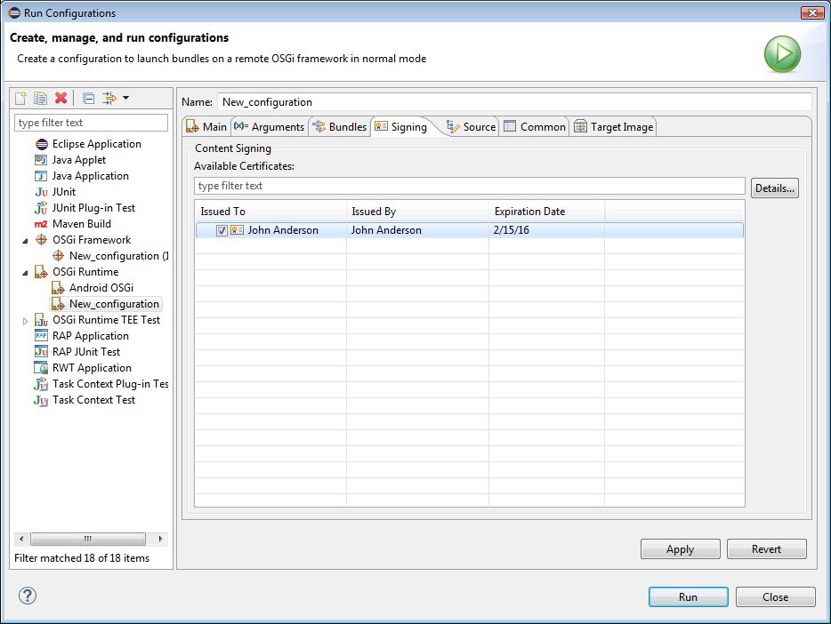 Optional. To sign the bundles from the workspace prior to their installation on the emulated OSGi framework: