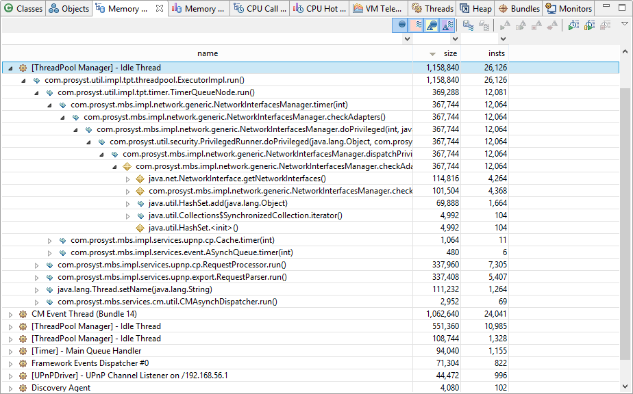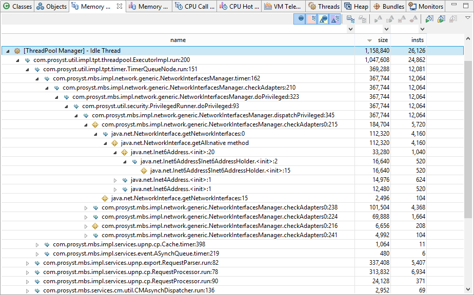 Show method precision / Show line precision – Determine if several lines of the same method call will be united in a single entry in the Memory Call Tree and the CPU Call Tree (if the sampling method is used). For example, if you select the Show line precision option, three samples of the same method call located in different lines in the application's code will be displayed as separate stack frames like this: