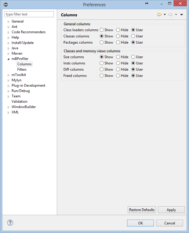 The Columns group of mBProfiler preferences allows you to control the appearance of the tables containing profiling data. You can show and hide each of the listed columns using the Show and Hide options. The User option means that the display of the corresponding column will be controlled through the Choose Columns popup menu command available for each table.