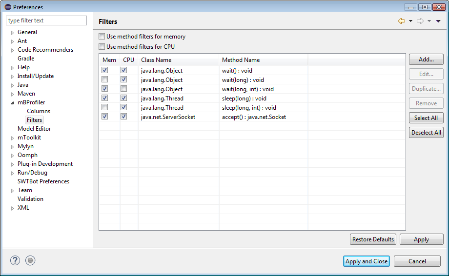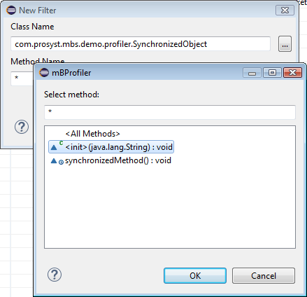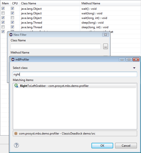 mBProfiler introduces filters for excluding specific methods from the call trees. Such methods are always selected as hot spots and can potentially disturb the results – for example in CPU profiling when Use real CPU time is off. Usually, such common methods are the Object's wait methods, Thread.sleep(), etc.