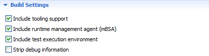 The Build Settings section of an Image Description editor contain options for adding capabilities for testing and image management on a native level, as well as for some code clean-up.