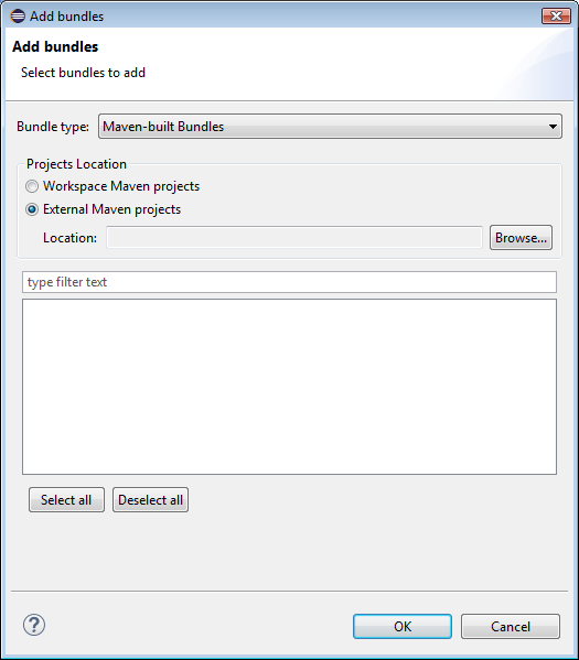 To add bundles which are modeled as Maven projects either from the Eclipse workspace or from a location outside the development environment: