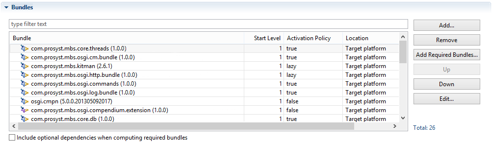 To include all bundles from the target platform and from the workspace that are needed to resolve the dependencies of the bundles currently added to the target image, click the Add Required Bundles button. You can choose to include optional dependencies by selecting the Include optional dependencies when computing bundles requirements checkbox.