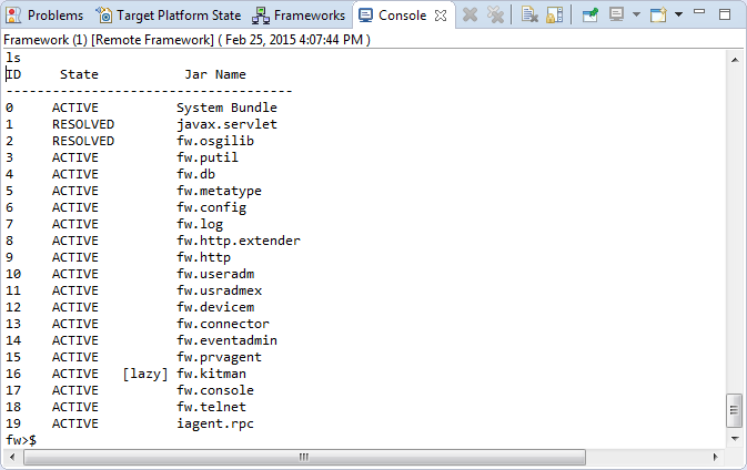 You can issue console commands remotely to a connected OSGi framework from the Eclipse Console view. Type the command in the Console view and press ENTER. For a list of support OSGi framework management commands, use the help command.