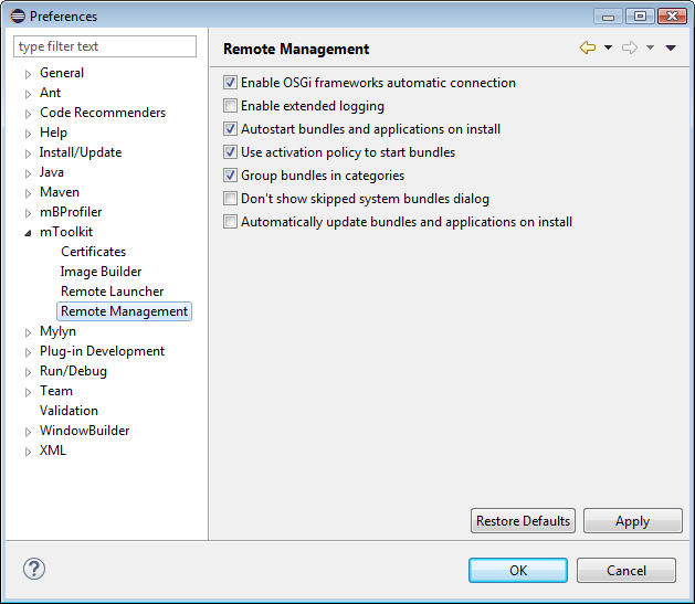 mToolkit allows you to customize remote management of OSGi frameworks - you can configure mToolkit to automatically connect to frameworks which have been already connected by third party Eclipse plug-ins, or to have information about OSGi management logged.