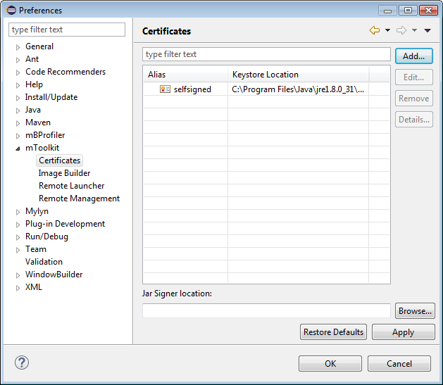 Enter the path to the jarsigner executable of your JDK in the Jar Signer Location text field or use the Browse button to locate it in the file system. It will be used to sign bundles and deployment packages.