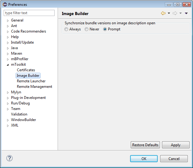 The Image Builder tab allows us to set up bundle version synchronization when an image is opened inside Eclipse.