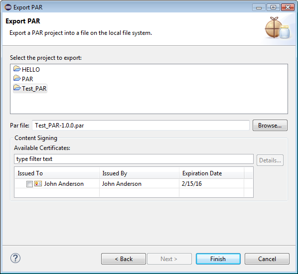 In the Export PAR wizard specify: