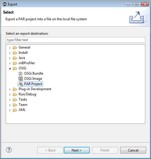 Right-click on the the PAR Project or on its provisioning.xml file in a navigation view and use the File > Export menu option. Then, expand the OSGi node and select the PAR Project node to launch the corresponding wizard. Click Next.