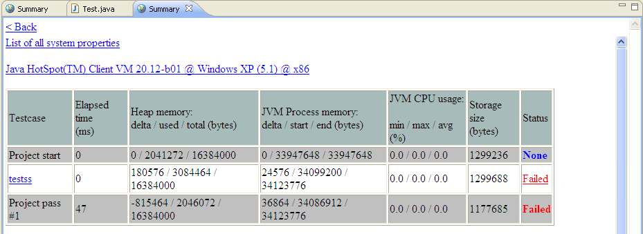 The test case will be executed. A summary of the results will be displayed in the Eclipse web browser: