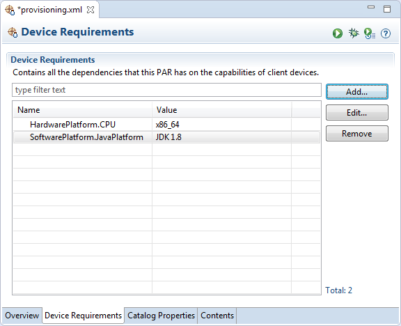 The requirements of a PAR file determine the capabilities of devices on which it can be deployed. To specify the device requirements, go to the Device Requirements tab of the PAR Editor.