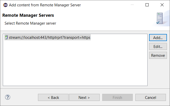 Select the Remote Manager server hosting the Software Repository in the next step. In case the Remote Manager servers list is empty, click Add and fill in the connection properties of a new Remote Manager server as described in the previous chapter. Otherwise, select the target Remote Manager server and click Next:
