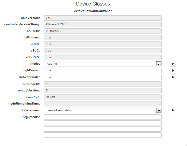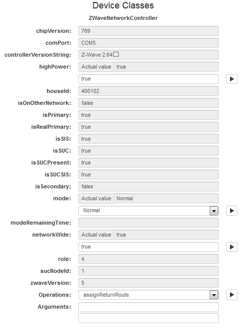 In the Device Information window that appears, locate the Device Classes section which lists the contained ZWaveNetworkController device class object and its properties. The device class object's mode options are available in the mode box.