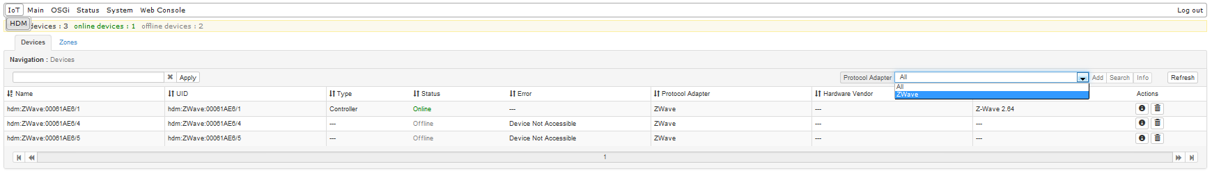 After setting up the environment, open the Web Admin Console page in a browser and log in. Serch for the IoT -> HDM tab and click on it. This opens the Home Devices page with the Devices tab selected by default. You can filter out only the available devices that communicate over the Z-Wave protocol by selecting Z-Wave from the Protocol Adapter box.