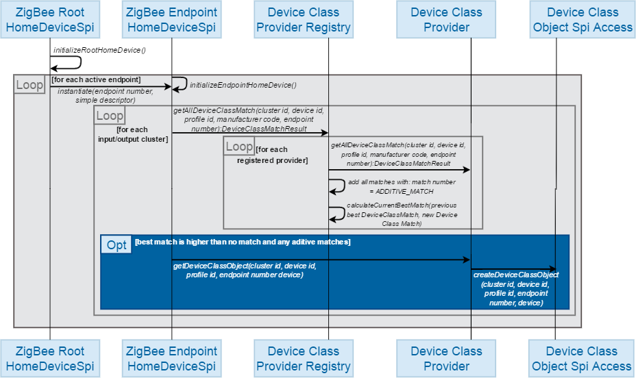 The ZigBee DA HDM Adapter queries all the tracked DeviceClassProvider-s during the home device initialization. This is done in order to find the best matching device classes to map over the currently supported clusters on the ZigBee device that is being represented. Each available device class provider is requested for a match given the cluster identifier, profile identifier, device identifier, manufacturer code and other ZCL properties that are read from the ZigBee device.