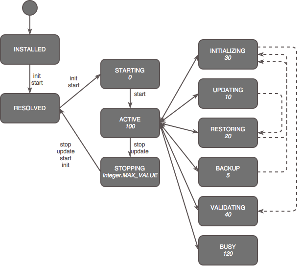 During the lifecycle of an OSGi framework the installed components (bundles or applications) go through different states. The OSGi specification defines several standard states and the framework implements several other called "user states".