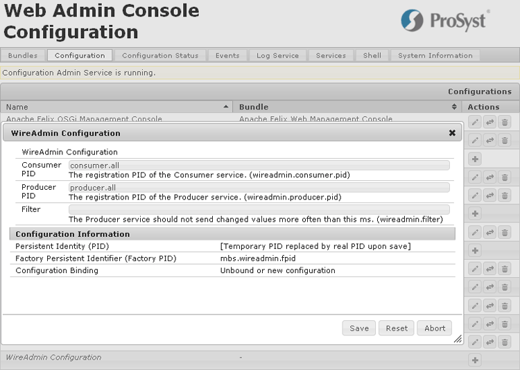 Web Admin Console allows easy management of available wires through the WireAdmin configuration. To enter the property editor dialog of the WireAdmin configuration, go to the Configuration page and select the WireAdmin Configuraiton row from the Configurations table. The WebAdmin Configuration dialog contains the properties contained in this factory configuration and allows you to administer them. Description of the properties is available in the Configuration Resources part.