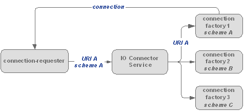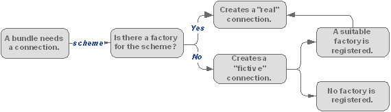 The communication implementations are registered as services called "connection factories". They are represented by the org.osgi.service.io.ConnectionFactory interface. Each connection factory declares the types of connections it implements by registering for a particular scheme. A scheme is the protocol or pattern of communication implemented. A bundle which demands a connection must pass to the IO Connector Service a valid Uniform Resource Identifier (URI) starting with the expected scheme. The scheme is the part of the URI before the first ":". When the IO Connector Service receives the URI, it parses it and then redirects the URI to the appropriate connection factory.