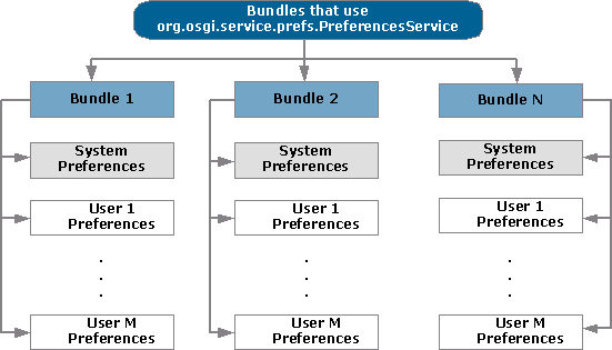 The figure below is of a Preferences tree, created by the simple bundle from the code example, that uses both interfaces, PreferencesService and Preferences. The root represents a node with the system preferences. There are two more nodes and each of them represents the preferences for a specified user. (For the example the users correspond to user1 and user2). The put(String, String) method associates the specified value with the specified key in this preference node. The string "FirstUser" is the specified value for the user1. The get(String, String) method returns the value associated with the specified key in this preference node.