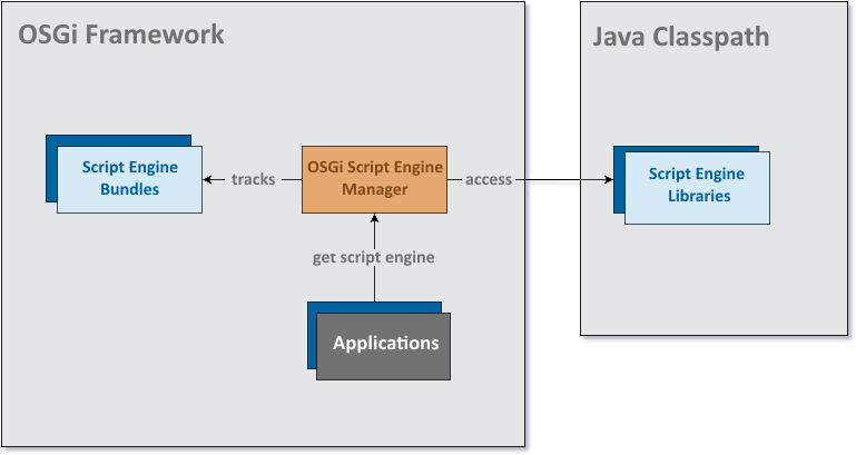 As defined in JSR-223: Scripting for the Java Platform, script engines are deployed in Jar files and the Service Provider mechanism described in the Jar File Specification can be used for their discovery. The Scripting module supports both engines available in libraries on Java Classpath as well as script engines packaged as bundles installed on the OSGi framework.