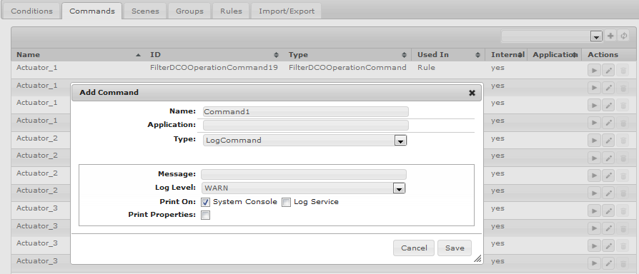 The interface visualizes information about a given command or condition by displaying its configuration properties in an HTML template, which is embedded in the Home Automation page. From this template, users can assign new values to the properties and save their changes thus updating the configuration.