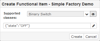 The Factories allow easy creation of new functional items by using a predefined template with properties and operations. You can use an existing factory by clicking the