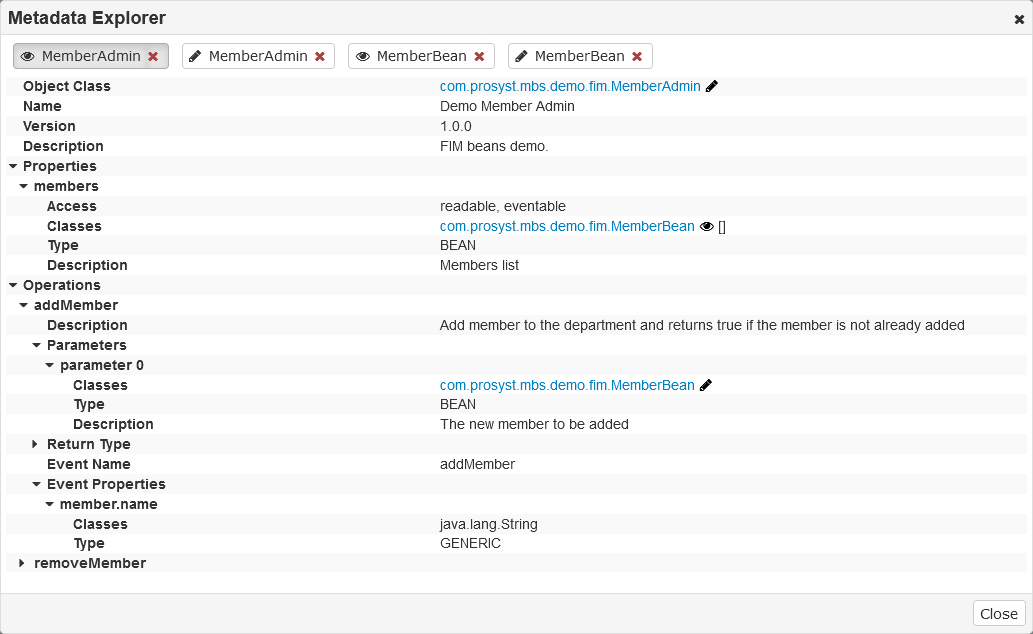 Clicking on the Object Class' name opens the Metadata Explorer window. The Metadata Explorer displays the Name, Version and Description of every Object Class with its related Properties, Operations, and Operation Events, if any.