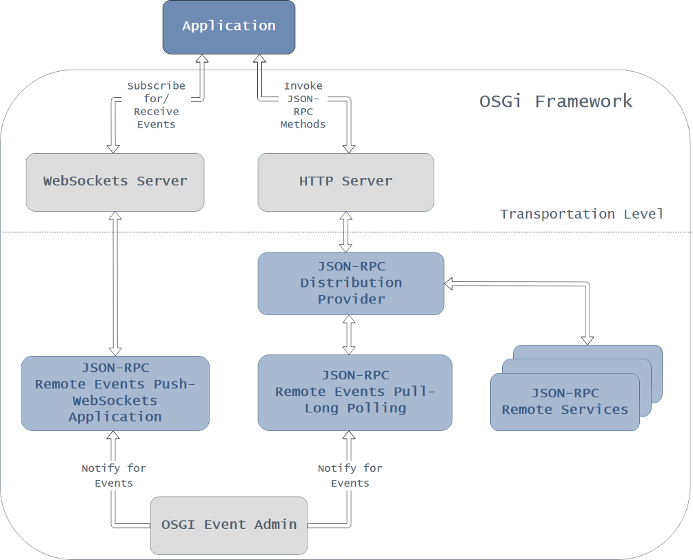 Application – invokes JSON-RPC methods to communicate with the OSGi HTTP Service Implementation, i.e. the HTTP Server.