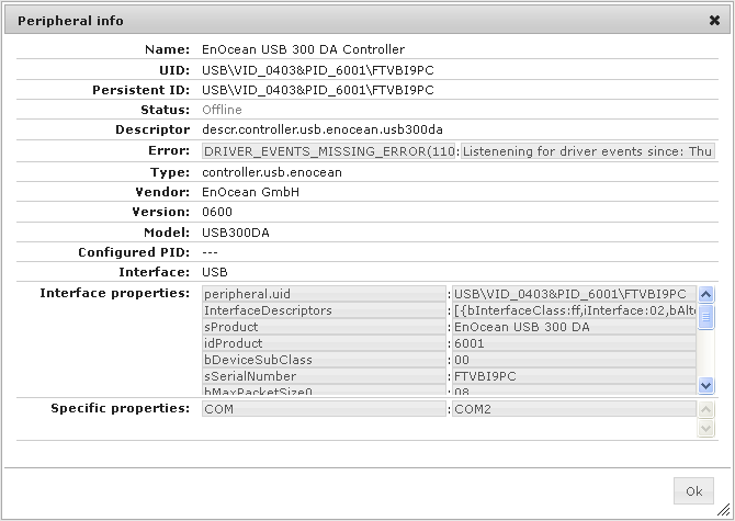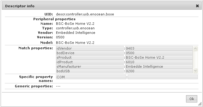 This information, as well as the Match properties for a device, the Specific property names and the properties such as type, vendor, version, etc. are displayed in the window that appears after a click on the Descriptor Info button on the row with the respective device.