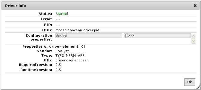 If you click on the driver info button a window is displayed which presents the driver status and the PID/FPID, whichever is relevant.