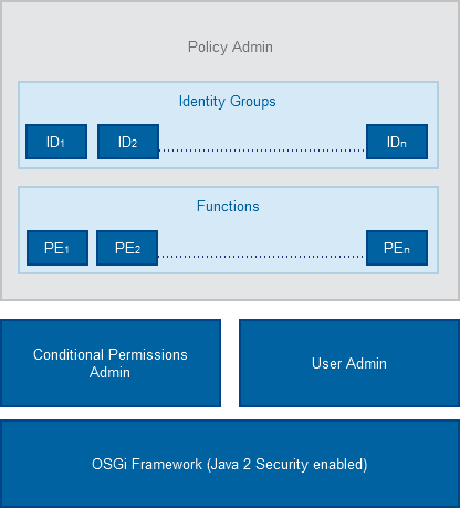 Each Identity (ID) represents an identifiable actor in the system for which a policy might be applied. Typically an ID can represent an user or locally-running code (bundle), or remotely running code (3rd-party server accessing remote services), etc. It is possible to define new Identities based on OSGi Conditions and they can be also used by Conditional Permission Admin Identity.