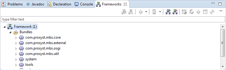 The Frameworks view provides the means for administration of remote OSGi frameworks. It supports connecting to OSGi frameworks as well as deployment and management of bundles and applications. For each successfully connected framework, the Frameworks view provides a tree with the bundles, deployment packages, services and applications available on an OSGi framework as nodes.