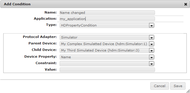 Constraint - Optional. You can specify some constraint property value that will be used for comparing the changed device class object property to the one defined in the Value field.
