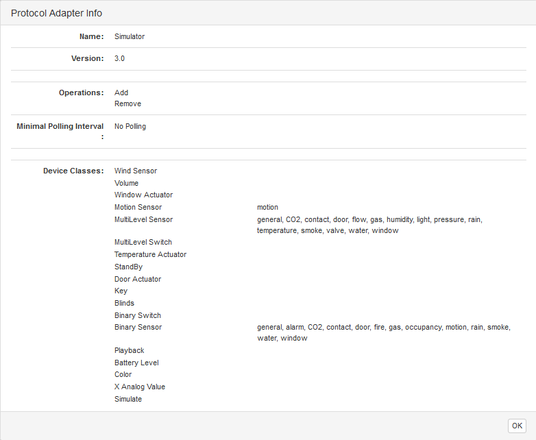 You will see all operations supported by the protocol adapter, the minimal interval for device property polling and the device classes that it supports.