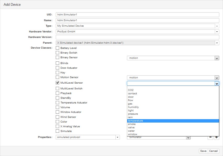 You can change the device attributes as well as define additional properties in the Properties list if required. In particular, you can modify the attributes: UID, name, type, vendor and version; and additional properties: user-defined and writable adapter-handled properties depending on the nature of the protocol, which the adapter usually populates with some default values.