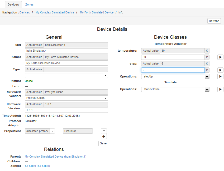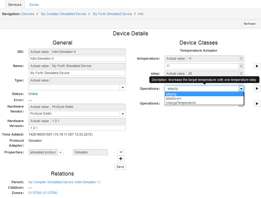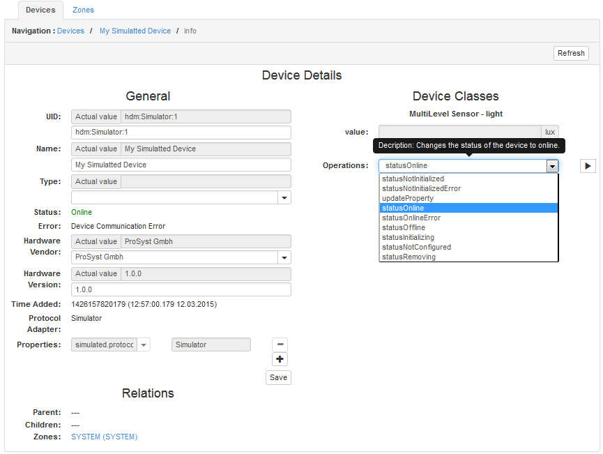 Besides the details of the device itself, under Device Classes it shows the device class objects that the device has. There you can manipulate the device class objects by launching an operation on or modifying a property of a device class object.